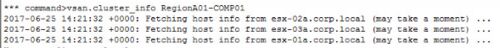 (本検証実行時のvCenter Serverのバージョンは6.5.0、ビルドは4602587です) vSAN.Cluster_Infoの出力情報についての紹介です。 まずコマンドを実行すると、次のようにクラスターに参加しているホストに対し情報取得が実行されました。 以上の出力から、3ノー…